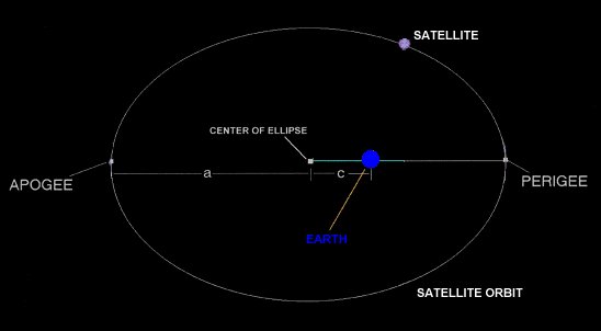 The Eccentricity (e) defines how oval the satellite's orbit is. It is mathematically defined as the ratio of the orbit's focus distance (c) to the orbit's semi-major axis (a).