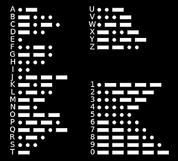 Just over 150 years previously, more specifically in 1836, Samuel Morse began the code that would bear his name. He needed a code that could be used with the new telegraph system being constructed in the United States. The early telegraph was an electromagnet that would emit clicks for specific amounts of time to discern between the "dots" (·) and "dashes" (-) that a letter, number, or punctuation symbol, would be comprised of. A letter could have a single dot (or dash), two, three, or four individual characters comprising of dots and dashes. A letter used more often in sentences, such as "E" (·) or "T" (-) would have one or two characters. On the other hand, characters used least often, such as the letter "Q" (- - · -) or "Z" (- - · ·) would have four characters. A number would have 5 characters. Punctuation would have 6 characters. The punctuation period is denoted by " · - · - · - ". Figure 1 shows the international Morse Code for letters and numbers.