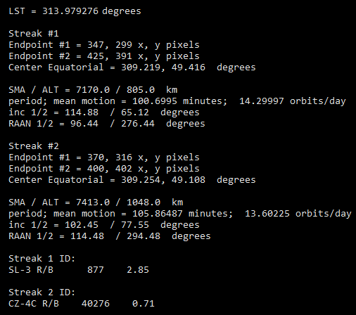 Figure 7 shows the results of my first (nearly) end-to-end satellite tracking software in its present form. The software was able to positively identify both of the two satellite streaks in the image, estimate their endpoint locations, determine the satellites' semi-major axes, orbit inclinations and the locations of their ascending nodes. Finally, the software has been able to correctly identify both of the satellites. These are very encouraging results which motivate me to continue to develop this software so that one day other other users can successfully detect, track, determine orbits and identify the satellites that they detect.