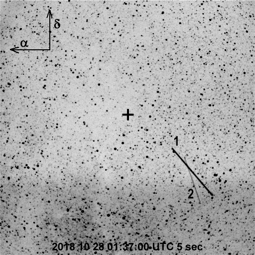 The streaks are identified as "1" (brighter streak) and "2" (fainter streak). The location of the local zenith is identified as the "+".