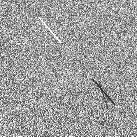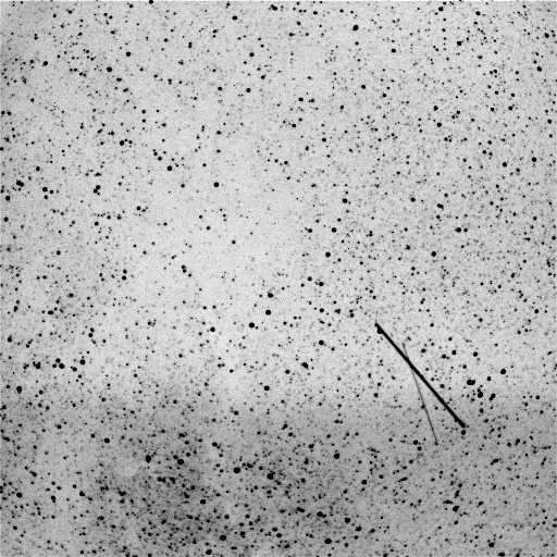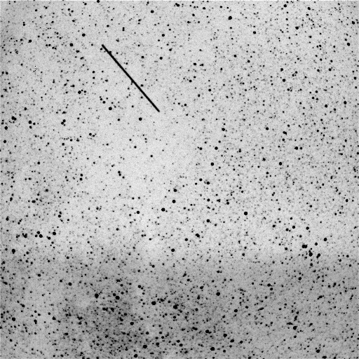 Note that in the subtracted image (at right in Figure 2), the streaks from the first (left) image appear black and the streak from the second (middle) image appears white. Since these are all negative images, a white object is actually darker than a black object. Therefore, the white streak is comprised of very low (zero or nearly zero) brightness values because of the subtraction of the streak from the background in the first image. Note that the background in the subtracted image appears noisier than the backgrounds of the first and second images. This is due to increased contrast and not due to an increased background noise. Finally, note that a number of the brightest stars remain after the subtraction, as expected.