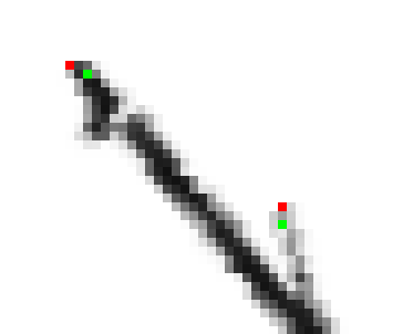 Figure 5: Endpoint detection of two satellite streaks. The pixels in red depict the first detected pixels found in the scan. The green pixels depict the actual endpoint of each streak, determined by the software.