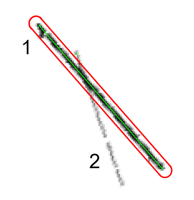 Subsequent streaks in the image (if any) are located in a similar fashion to the first. However, how does the computer know not to relocate the first streak and think it is another streak? To avoid streak re-detection, the slope and intercept of the first streak (considering the first detected endpoint as the origin) are recorded. A 5-pixel zone is drawn around this linear streak. A potential second streak endpoint can only be valid if another non-zero pixel value is found and is greater than 5 pixels from the minimum pixel distance from the first detected streak. If the next endpoint candidate is located at a minimum of less than 5 pixels, then it is considered a part of the first detected streak. Of course, this method can be modified such that a variable-sized zone, based on the thickness of the first streak, is used instead of a constant 5-pixel zone. However, this method is suitable for testing purposes, especially if the two streaks are not located very near each other within the image.