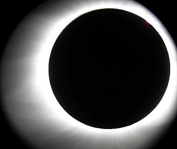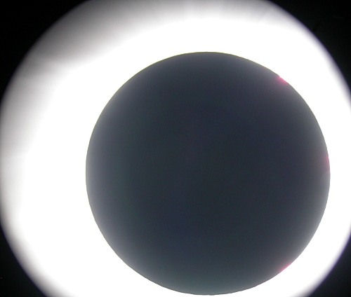 Totality! In this, the second image of totality, the bright corona is overexposed but several prominences (red spots) could clearly be seen around the right hand side of the eclipsed Sun.