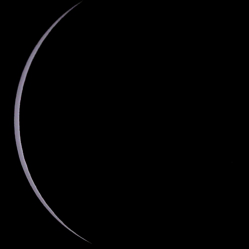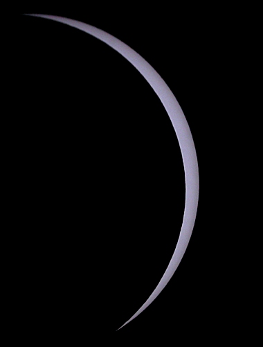The eclipsed Sun (left) and the planet Venus (right) appear together in this wonderful image. Although the Sun's phase is a thin crescent, the Sun still appears bright enough to easily overexpose the detector. Note that the sky is now a dark blue rather than the bright light blue it normally appears at mid-day.