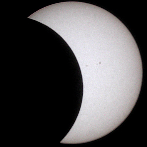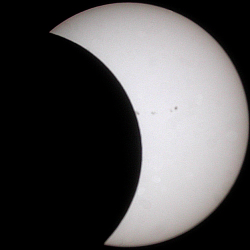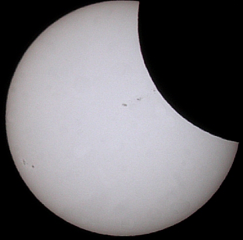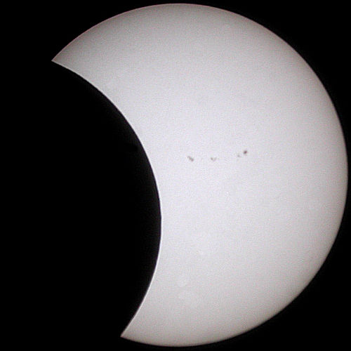 A fat crescent Sun has appeared! All of the central sunspots have been covered by the Moon's silhouette. Only the two sunspots on the left hand side of the Sun's face remain.