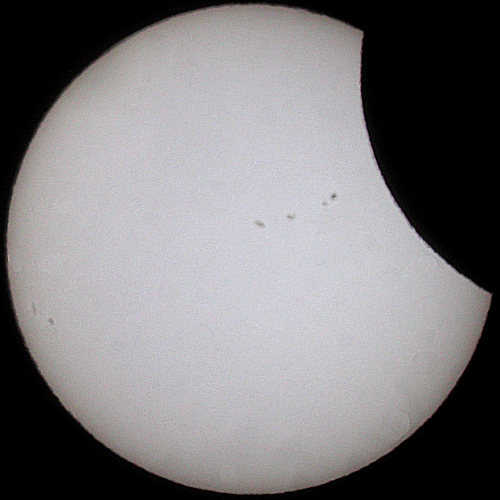 The eclipse continues. I remember being very surprised at how fast the Moon's silhouette was appearing to travel across the Sun's surface. The sunspots appear to be in the silhouette's sights.