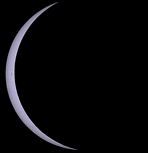 A thin crescent Sun has appeared! Two sunspots still remain on the left-hand side of the Sun's disk. However, the Moon will soon cover these sunspots too!