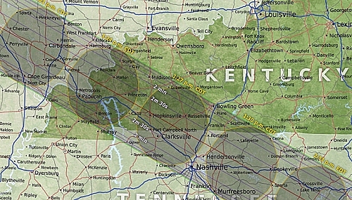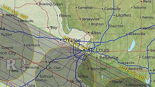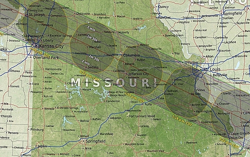 The path of totality through the states of Missouri (upper left), southern Illinois (upper right), Kentucky (lower left) and Tennessee (lower right). Images courtesy of NASA