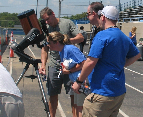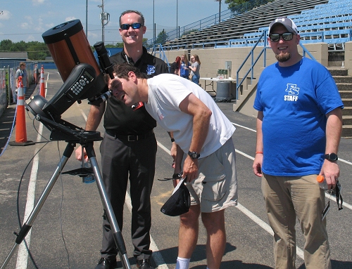 Dr. Mike observes the Sun through the Celestron 8i telescope before inviting Scot Perdue (left, black shirt) and Seth Armour (right, blue shirt)  to have their first look at the Sun through the telescope.