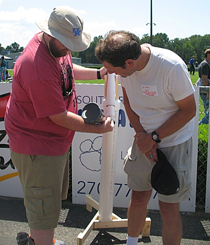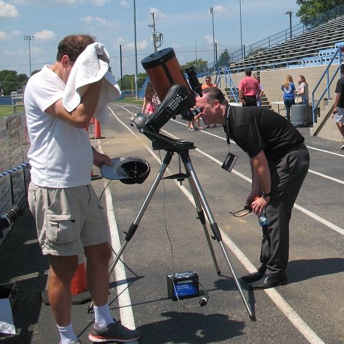 Scot Perdue, Director of Technology for the Schools of Simpson County, Kentucky, observes the Sun through the telescope as Dr. Mike towels the sweat off of his face.