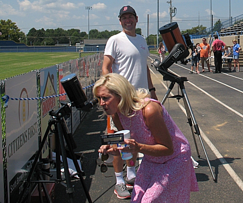 About 30 minutes into the eclipse, students were beginning to arrive at the stadium and football field. Both adults and children saw the two telescopes and immediately wanted to observe the Sun through them. At first, a number of the audience members were trepidatious about observing the Sun through a telescope. After I had described that the Baader filters reflected about 99.999% of the incoming sunlight, they were more at ease. After another hour into the eclipse, few were scared about looking at the Sun through the eyepiece. My wife Jane helped to orient the viewers to the scopes and answer questions.