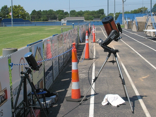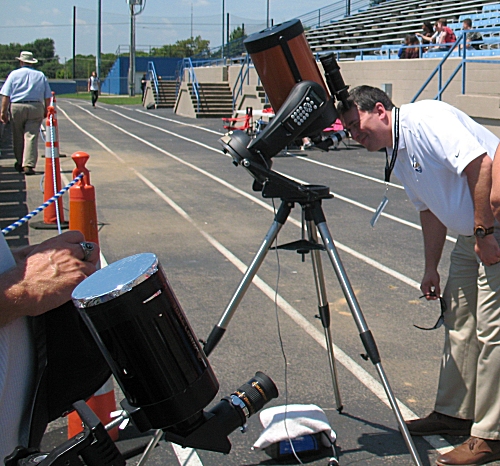 I set up my two telescopes on the opposite side of the track from the stadium at about 10:30 a.m. CDT; one and a half hours before the eclipse was predicted to begin. I took my first image of the Sun that day at 10:56 a.m. CDT. When I first looked at the Sun through the 40mm eyepiece, I was delighted to learn that a large crop of sunspots was populating the Sun's disk. I knew that the audience was in for a treat because not only would they see the eclipse but also a myriad of sunspots. There were very few people at the stadium at that time; just a few photographers on the stadium roof and the maintenance crew that drove by once in a while. The temperature was very high; about 100 degrees Fahrenheit with a humidity of nearly 100 percent. I was concerned for the safety of the equipment since I had not used either scope in such high temperatures. The 8-inch scope was powered by a small 12-volt lawn tractor battery that I had bought a few days before. I decided to cover the battery with a white towel so that the intense sunlight would not overheat it and cause the battery to leak. From time to time I would feel the battery to make sure that it was not too hot.