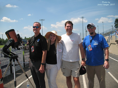 From left to right, this image features: the Celestron 8i telescope (extreme left), Scot Perdue (second left in black shirt), Jane Yaeger (second left in wide-brimmed hat), Dr Mike (second right in white shirt) and Seth Armour (right in blue shirt).