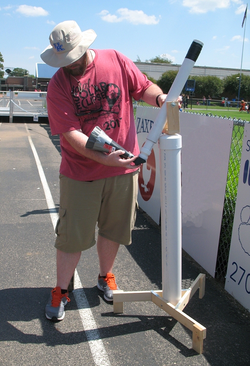 The Exploratorium is a building in the Franklin Simpson High School campus that is a "makerspace and project-based learning center". Students are able to have hands-on experience with science and technology. Jane and I were impressed with the amount of space and the equipment available; from Lego blocks to full 3D printers. Just one week before the day of the eclipse, Matt was teaching the students how to build a simple Alt-Azimuth telescope out of PVC pipe and lenses. I spotted one of the telescopes in the corner of the room. I tried it out and could easily see a bird perched on the high stadium lights through one of the windows. Matt was explaining to me that he and his students spotted Saturn's rings through these telescopes. Matt certainly shared the passion that I have for teaching the youth about science, technology and astronomy. Matt had been working on the total eclipse event at Franklin Simpson High School for over a month, including the initial proposal to administration, marketing (including eclipse viewers and t-shirts) and intricate planning for the day of eclipse.